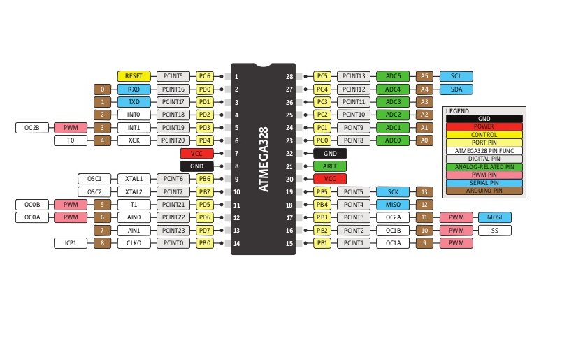 El ATmega328p que es el microcontrolador montado en la tarjeta arduino UNO/NANO y como cualquier otro microcontrolador tiene registros, algunos de estos registros están conectados con los puertos de entrada/salida, cada puerto tiene un nombre específico