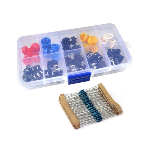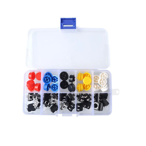 Descripción Kit de 25 botones pulsadores de 5 colores (Rojo, Azul, Negro, Amarillo y Blanco) el kit incluye un organizador de platico y resistencia...