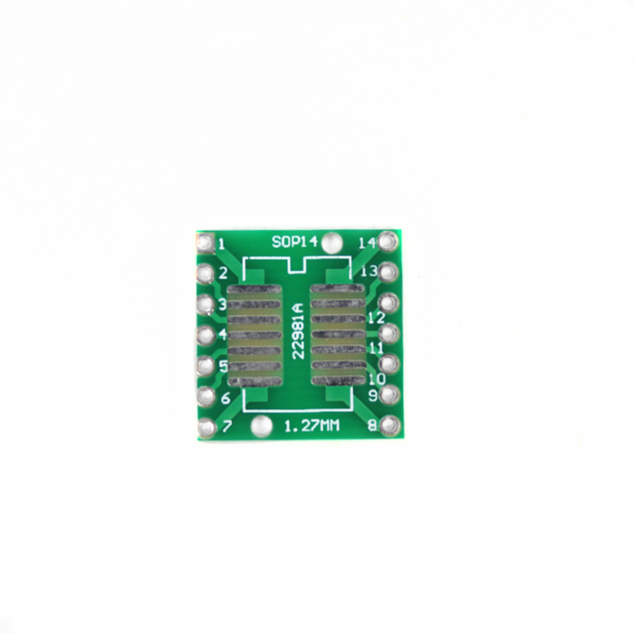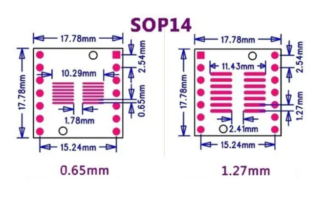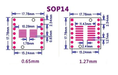 El paso de pin lateral A es de 1,27mm y se puede utilizar para la mayoría de los SO, SOP, DIP A DIP de 2,54mm. La placa es doble cara, de un lado SOP14 y del otro SSOP14