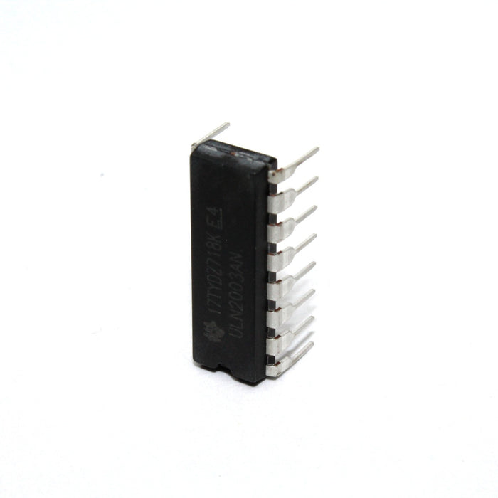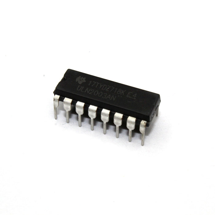 El ULN2003A es un arreglo de siete transistores NPN Darlington capaces de soportar una salida de 500 mA, 50V. Cuenta con diodos de retorno de cátodo común para la conmutación de cargas inductivas.