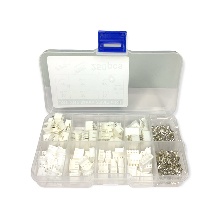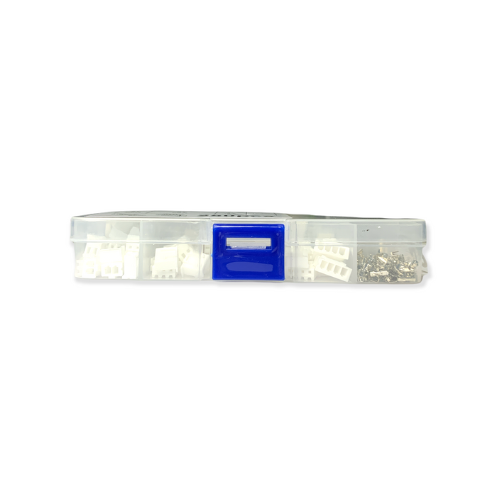 Kit de Conectores y terminales JST con espacio de separación 2.54mm de 2, 3 y 4 posiciones, 250 piezas , en caja con separadores es ideal para usar en en tarjetas pcb, estos conectores brindan flexibilidad para conectar y desconectar.