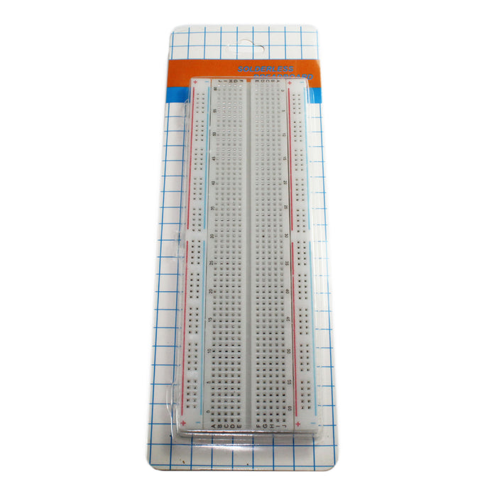 Tablilla de conexión (Protoboard), con 1 bloque, 2 tiras, sin bornes y 830 perforaciones, ideales para armar prototipos de circuitos electrónicos.
